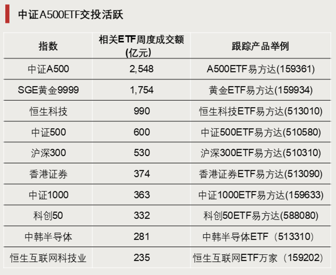 上周,A股大盘宽基产品成交活跃,其中A500ETF易方达(159361)等跟踪中证A500指数的ETF合计成交额超过2500亿元,科创50ETF易方达(588080)等跟踪科创50指数的ETF合计成交额超过300亿元。