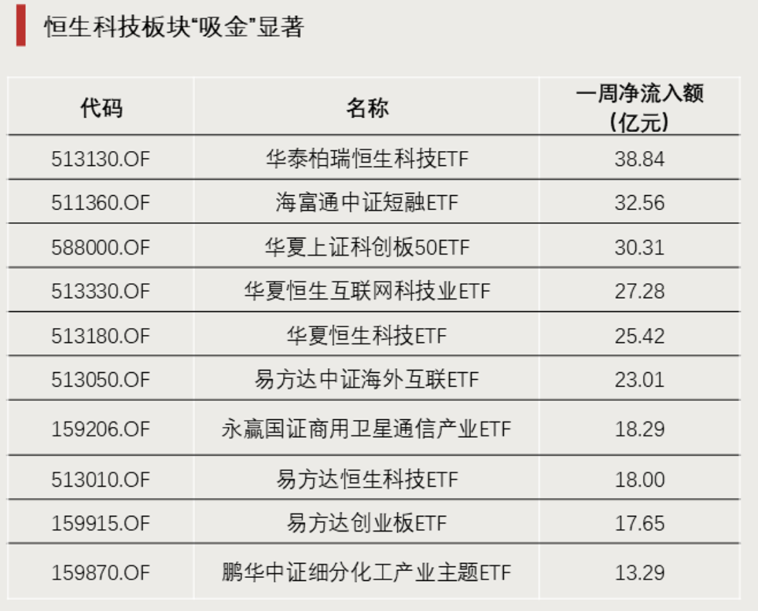 上周,恒生科技板块获资金大幅涌入,恒生科技ETF易方达(513010)、港股通互联网ETF易方达(513040)等多只相关主题ETF“吸金”显著。此外,化工、卫星通信等热门主题ETF亦获不少资金青睐。