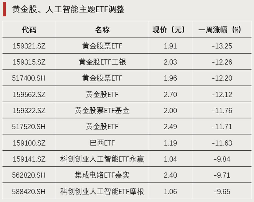 上周,黄金板块表现弱势。全市场14只商品型黄金ETF一周跌幅均超5%,而黄金股ETF的回调更加明显,相关主题ETF最高跌超13%。此外,多只人工智能主题ETF亦有显著回调。