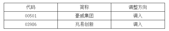 【大河财立方消息】2月9日,深交所公告,因豪威集团(00501)、兆易创新(03986)在香港市场价格稳定期结束且相应A股上市满10个交易日,根据《深圳证券交易所深港通业务实施办法》的有关规定,港股通标的证券名单发生调整并自2026年2月9日起生效,调入豪威集团、兆易创新。