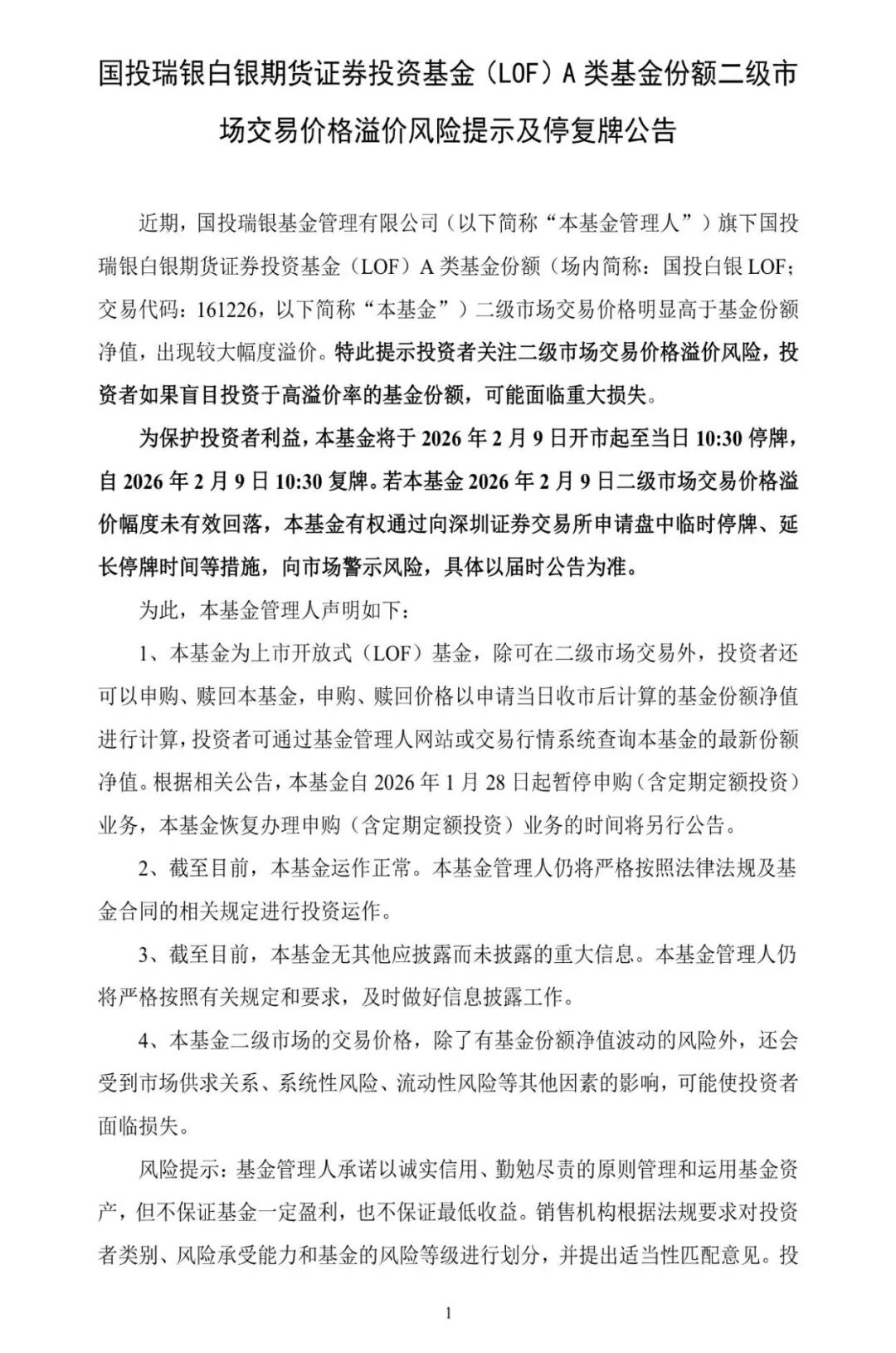 2月8日,国投白银LOF公告称,近期,国投瑞银基金管理有限公司旗下国投瑞银白银期货证券投资基金(LOF)A 类基金份额(场内简称:国投白银 LOF;交易代码:161226) 二级市场交易价格明显高于基金份额净值,出现较大幅度溢价。特此提示投资者关注二级市场交易价格溢价风险,投资者如果盲目投资于高溢价率的基金份额,可能面临重大损失。