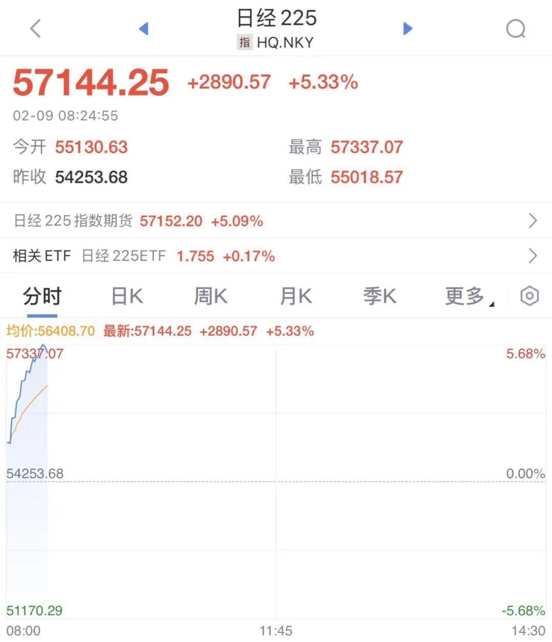 2月9日,日经225指数日内涨超5%,突破57000点,再创历史新高。