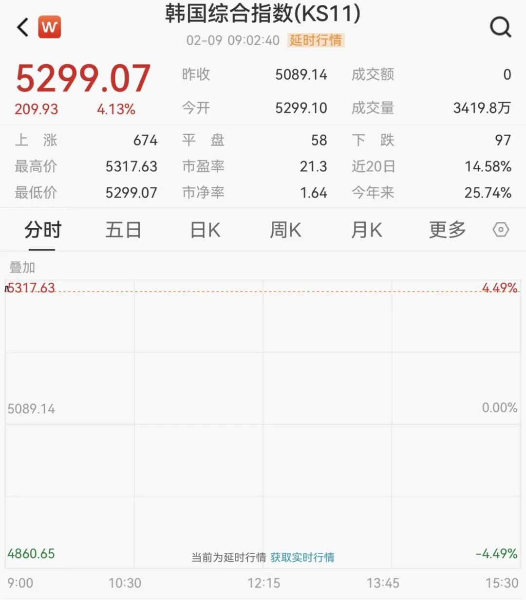 此外,韩国市场开盘大涨,韩国KOSPI指数涨4.13%,报5299.07点。