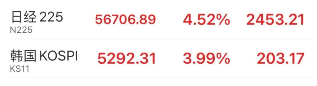 北京时间2月9日,日韩股市大幅上涨。截至发稿,日经225指数涨4.52%;韩国KOSPI指数涨近4%。在经历上周的巨震后,现货黄金盘初持续走高,重新站上5000美元/盎司;现货白银盘中突破80美元/盎司。