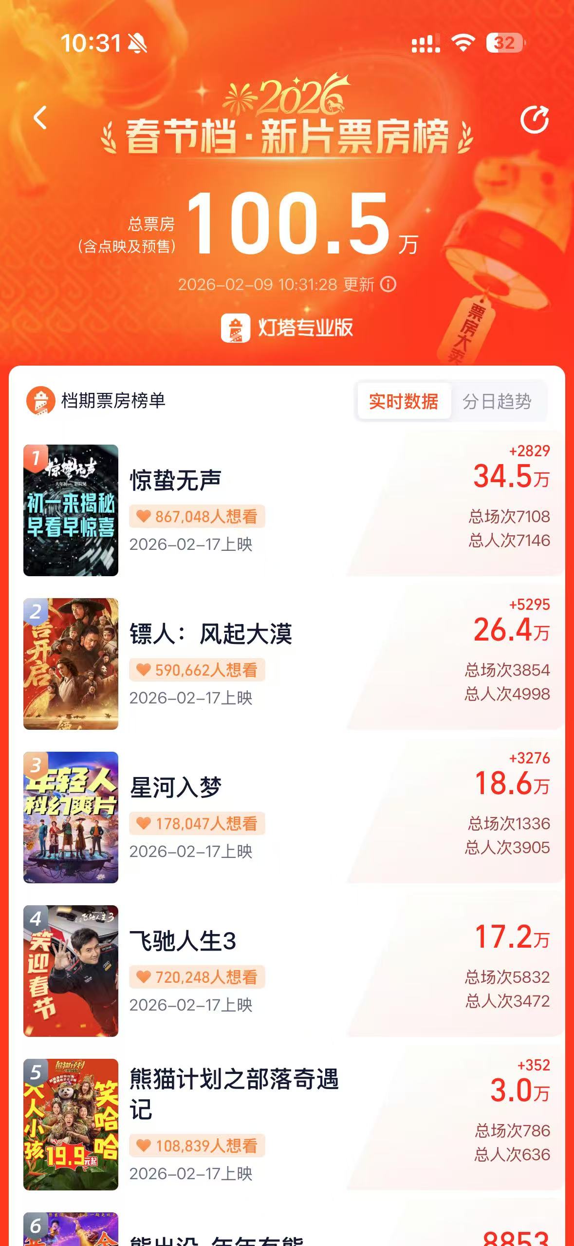 据灯塔数据专业版,截至2月9日10时31分,2026年春节档新片总票房(含点映及预售)破100万元。
