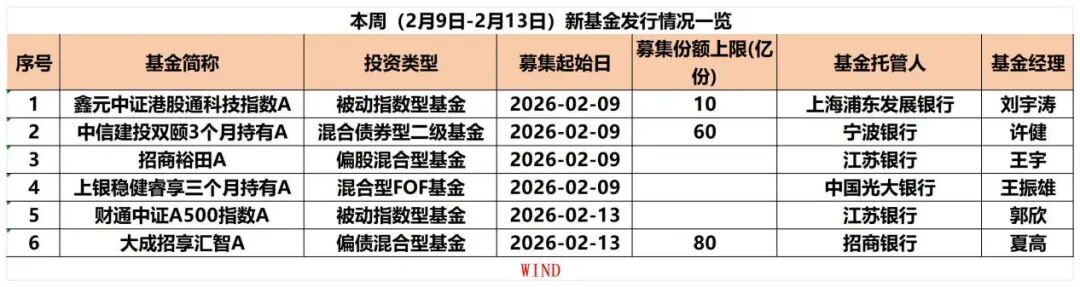 此外,鑫元中证港股通科技指数、财通中证A500指数等被动指数型基金也于本周发行。