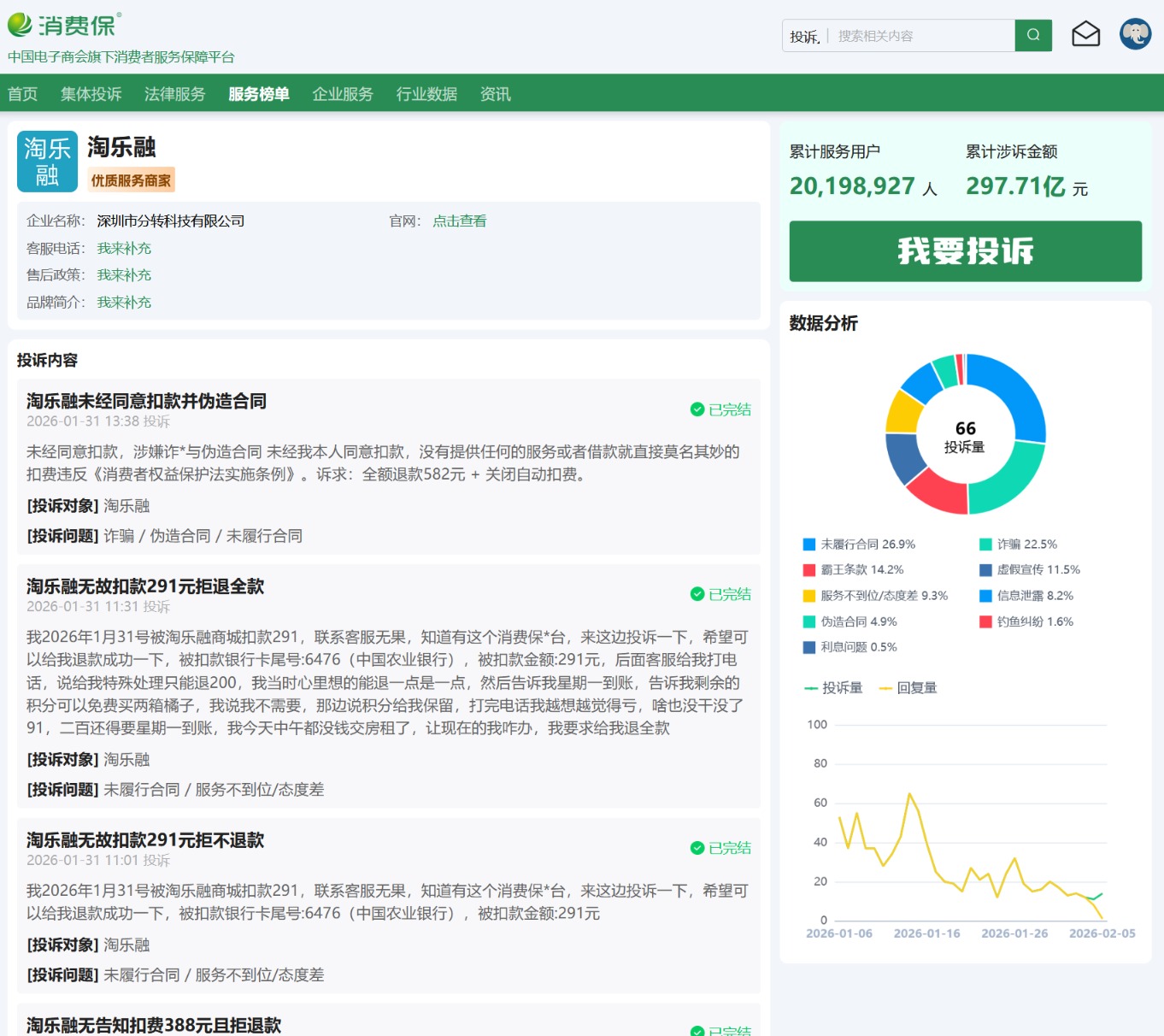 截至2026年1月,第三方投诉平台针对淘乐融的记录已超过千条,主要关键词涉及未经授权扣费、借款未果仍收费、退款困难等。用户在使用此类积分商城时,对自动扣费条款、服务关联及个人信息授权的仔细核查,显得尤为重要。