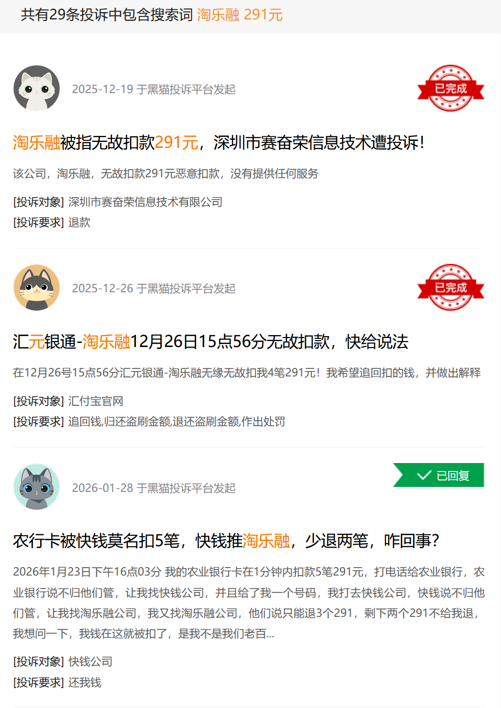 2026年初,多位用户在多个投诉平台反映,银行卡被“淘乐融”以每月291元标准自动扣款,部分用户称未明确授权。