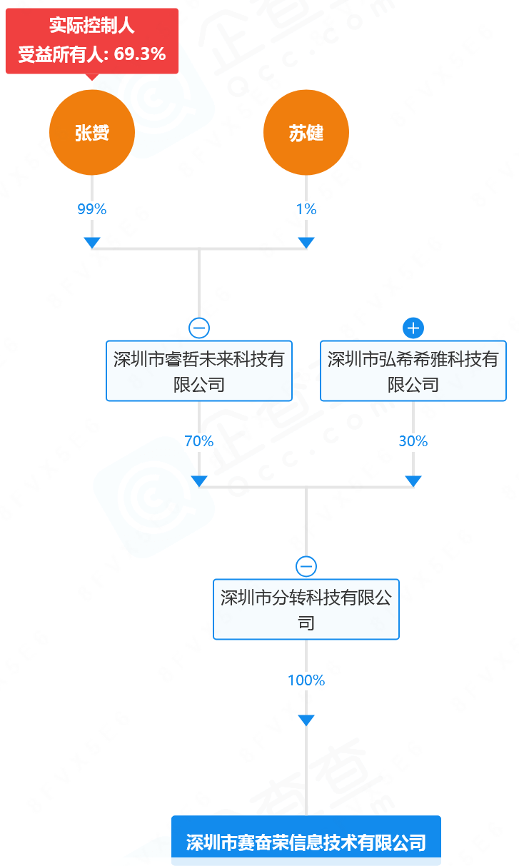 淘乐融的运营主体为深圳市赛奋荣信息技术有限公司,成立于2025年2月,由深圳市分转科技有限公司100%控股,两家公司实际控制人均为张赟,注册地址位于同一栋大楼的相邻门牌。后者成立于2023年10月,注册资本500万元,正是“分转商城”APP的直接运营主体。