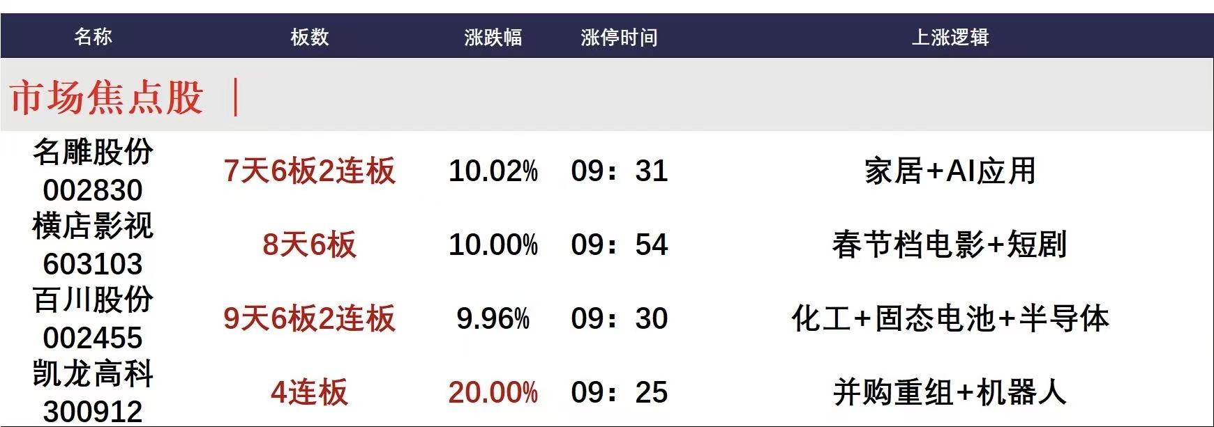 今日午盘全市场共75股涨停,连板股总数14只,17股封板未遂,封板率为81%(不含ST股、退市股)。焦点股方面,AI应用端的名雕股份7天6板,影视+短剧概念股横店影视8天6板,化工股百川股份9天6板,并购重组的凯龙高科20CM4连板。