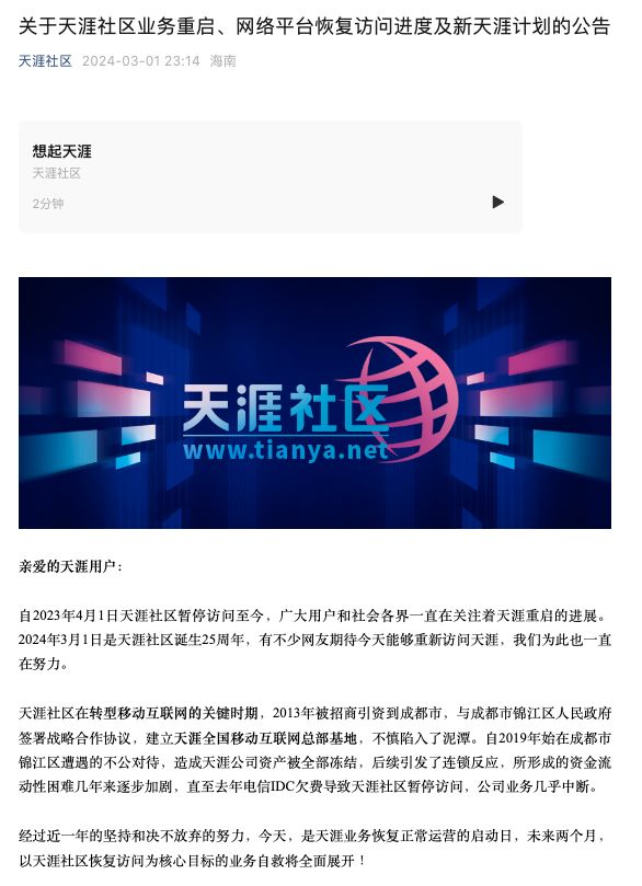 2024年3月1日,天涯社区曾发布关于业务重启、网络平台恢复访问进度及新天涯计划的公告称,将采取引入战略投资、恢复广告业务、启动社交电商平台及大力开展会员增值服务等方式筹措资金,在确保数据安全合规的前提下,在2个月内,即5月1日前恢复天涯社区访问。天涯社区恢复访问后,将启用新的国际域名tianya.net。然而,截至目前,天涯社区还未重启访问。