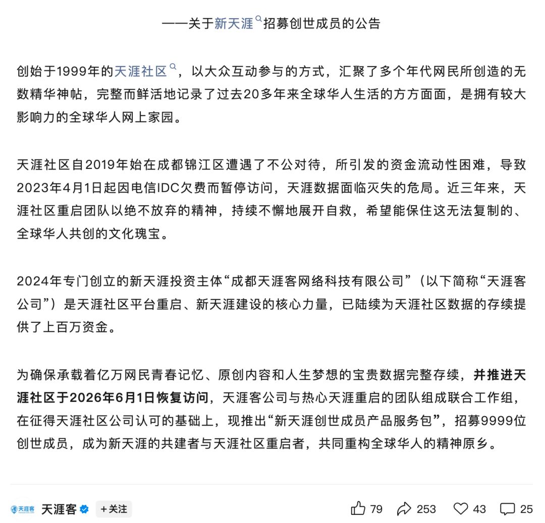 此外,公告还提到,天涯客公司与热心天涯重启的团队组成联合工作组,在征得天涯社区公司认可的基础上,推出“新天涯创世成员产品服务包”,招募创世成员,成为新天涯的共建者与天涯社区重启者。