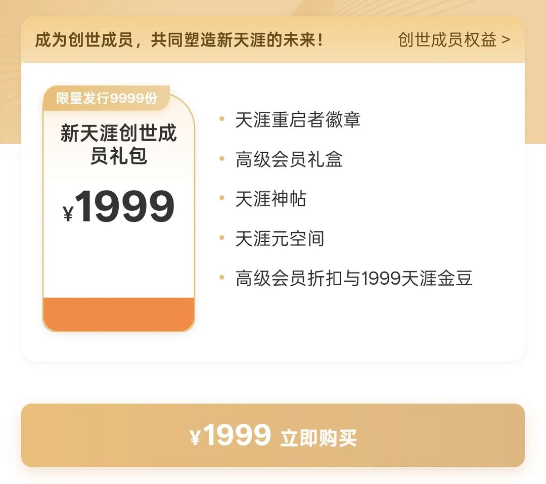 新天涯创世成员产品服务包全球限量发行9999份,售价:1999元/份,售罄即止,永不增发。所得费用均用于天涯社区数据存续、恢复访问及后续新天涯计划的落实。该份产品服务包的主要权益包括天涯重启者数字徽章、天涯客高级会员礼盒、官方天涯神帖付费专区10年免费阅读权限、天涯元空间等。