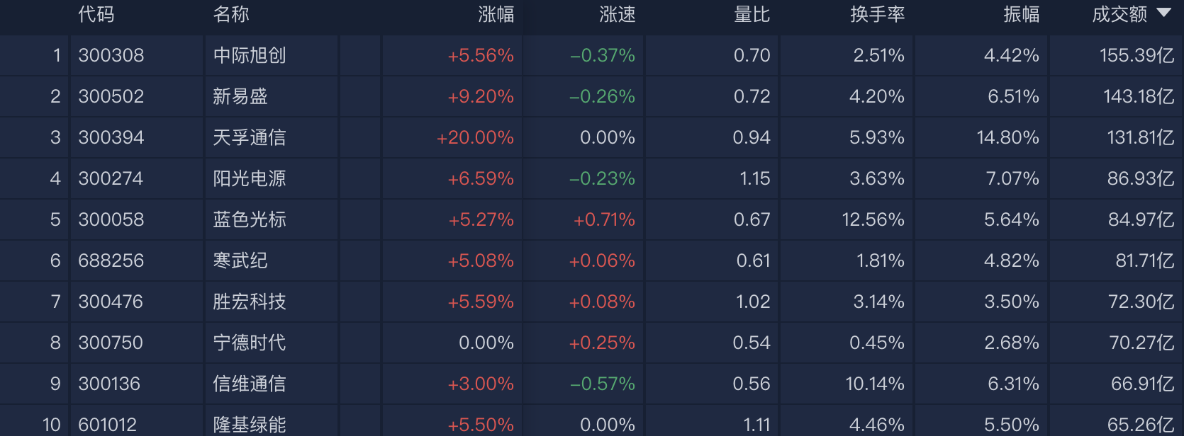 个股方面,中际旭创半日成交额155.39亿元居首位,新易盛、天孚通信、阳光电源等公司成交额靠前。