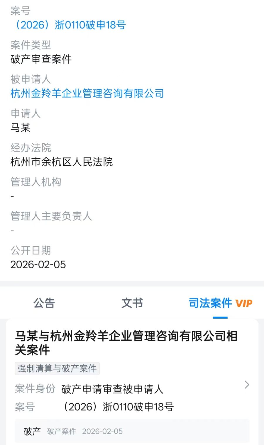 天眼查显示,近日,自嗨锅关联公司杭州金羚羊企业管理咨询有限公司(下称杭州金羚羊)新增一则破产审查案件,申请人为马某,经办法院为杭州市余杭区人民法院。