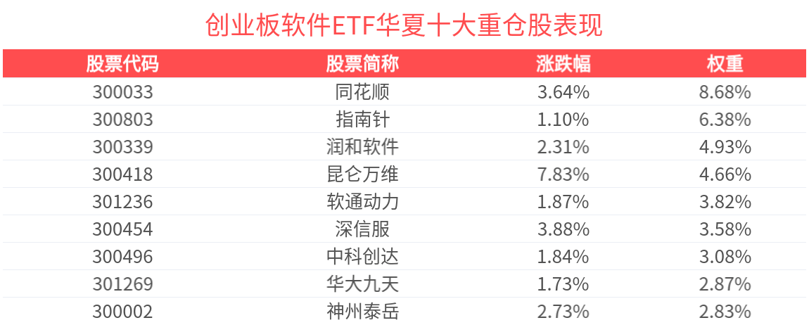 创业板软件ETF华夏紧密跟踪创业板软件指数,截至2026年1月30日,创业板软件指数(399264)前十大权重股分别为同花顺、润泽科技、昆仑万维、指南针、深信服、润和软件、网宿科技、软通动力、中科创达、汉得信息,前十大权重股合计占比48.61%。(以上所列股票仅为指数成份股,无特定推荐之意)