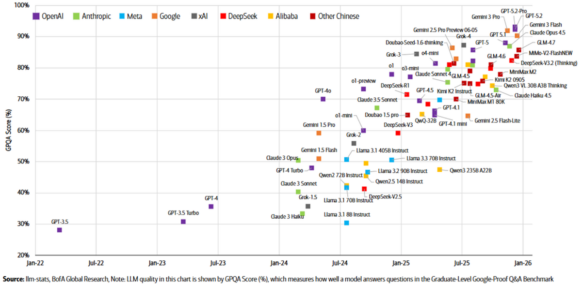 AI应用的重要驱动因素之一是大模型能力的持续提升。如图所示,纵坐标代表大模型能力,横坐标为时间轴。我们可以看到,过去几年大模型持续发展,其综合性能较最早的GPT-3.5已有大幅提升,其中DeepSeek、千问等大模型也在逐步追赶海外头部大模型的水平,这体现了国内大模型技术的快速追赶态势。