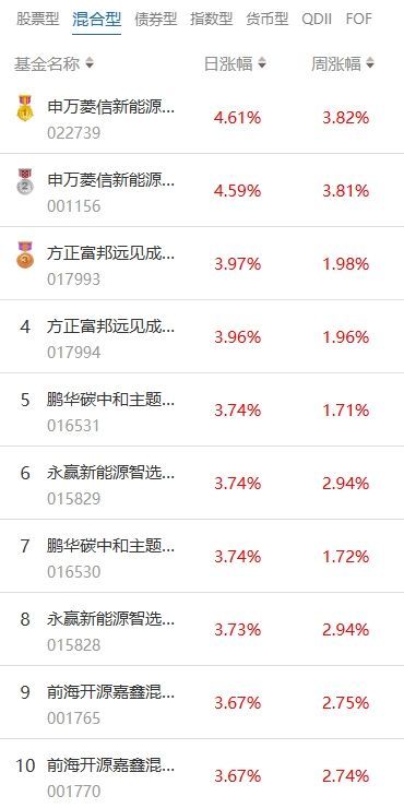 南方财经2月9日电,根据南财基金通数据:2026年2月6日当日收益靠前的混合型基金包括:申万菱信新能源汽车主题灵活配置混合型证券投资基金(022739,日收益4.61%);方正富邦远见成长混合型证券投资基金(017993,日收益3.97%);鹏华碳中和主题混合型证券投资基金(016531,日收益3.74%)等。收益较低的混合型基金包括:东兴数字经济混合型发起式证券投资基金(020441,日收益-3.08%);银河消费驱动混合型证券投资基金(015668,日收益-2.97%);华夏新材料龙头混合型发起式证券投资基金(017697,日收益-2.68%)等。