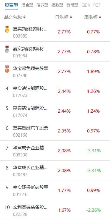 南方财经2月9日电,根据南财基金通数据:2026年2月6日当日收益靠前的股票型基金包括:嘉实新能源新材料股票型证券投资基金(003985,日收益2.77%);华宝绿色领先股票型证券投资基金(007590,日收益2.77%);嘉实清洁能源股票型发起式证券投资基金(017073,日收益2.44%)等。收益较低的股票型基金包括:创金合信软件产业股票型发起式证券投资基金(016074,日收益-2.44%);同泰数字经济主题股票型证券投资基金(012697,日收益-2.08%);创金合信软件产业股票型发起式证券投资基金(016074,日收益-2.44%)等。