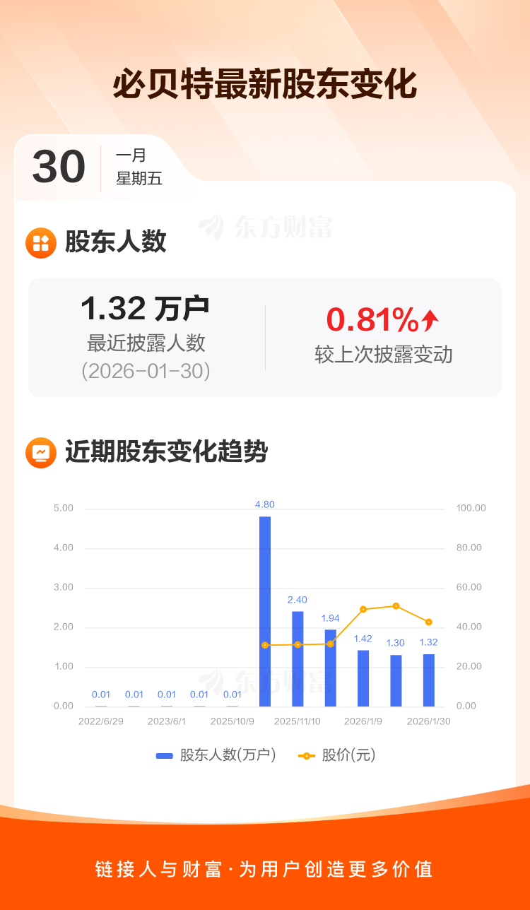 必贝特:截至1月30日最新股东户数1.32万户,较上期增加0.81%