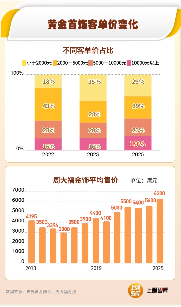 老铺的走红,也许可以看出黄金首饰消费的趋势:高端化、精品化。一方面,金价的持续飙升,不可避免让黄金首饰客单价显著走高。数据显示,2025年10000元以上的高客单价区占比已经升至19%。周大福财报中,内地市场金饰平均售价也从2013年的4195港元跃升至6300港元,涨幅超50%。