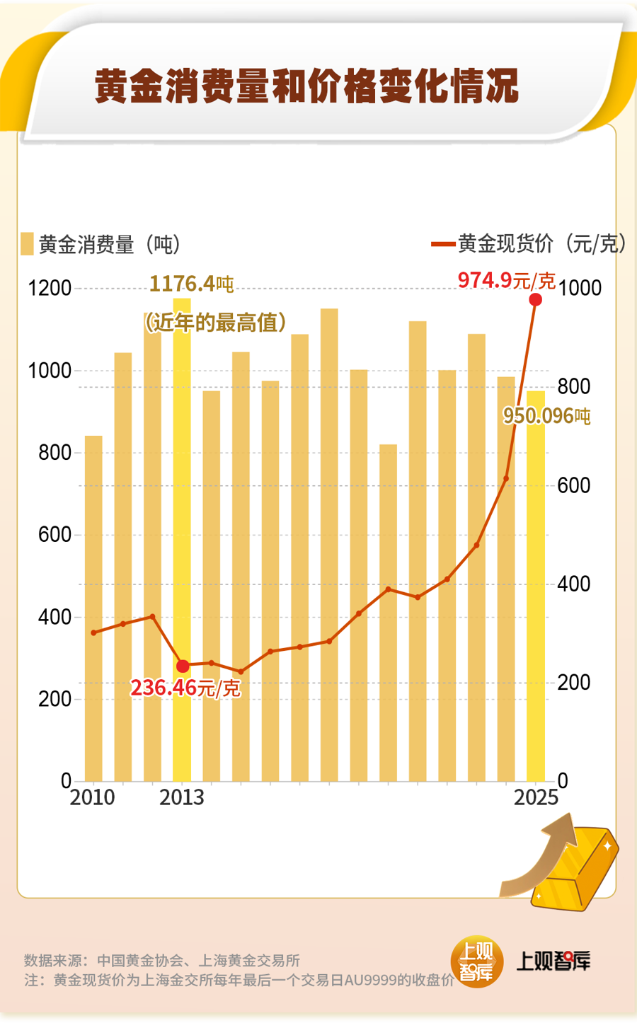 在金价狂飙60%的背景下,2025年国内黄金消费量虽然仍在950吨以上,但同比下降了3.57%。