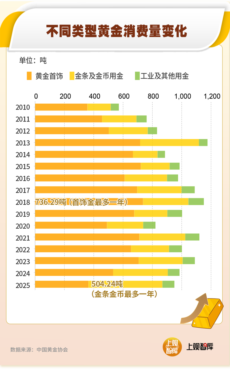 从历史数据看,黄金首饰用金量从2018年736.29吨的峰值,下滑到2025年的500吨出头,但金条金币消费量在2022年到2025年却实现了四连升,并在2025年实现了对首饰金的反超。
