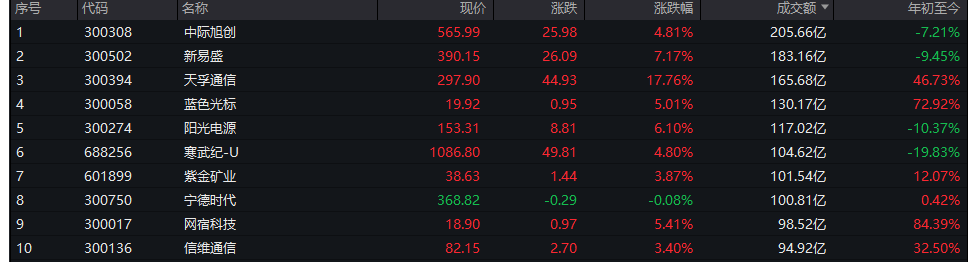 个股方面,中际旭创成交额近206亿元居首,新易盛、天孚通信、蓝色光标成交额靠前。