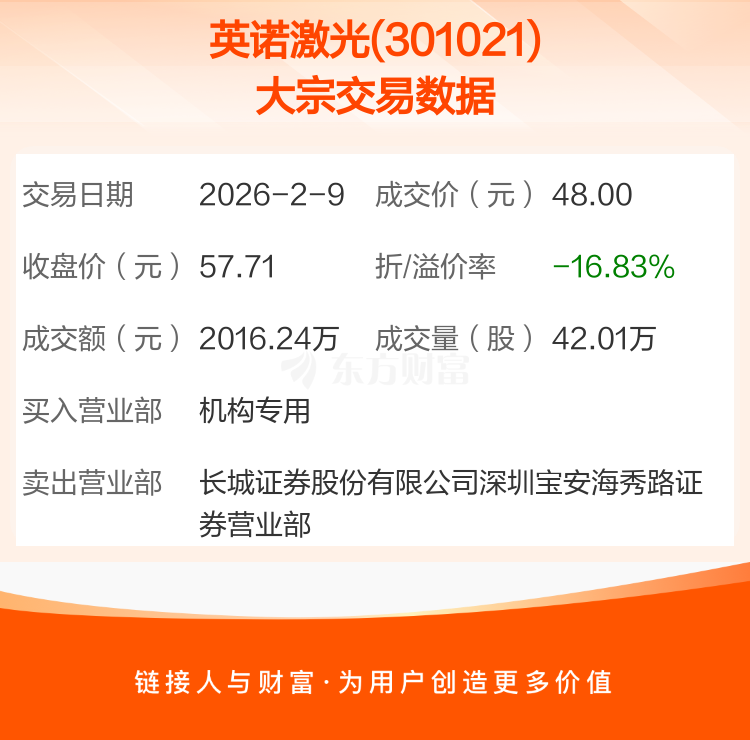 2026年2月9日,英诺激光发生1笔大宗交易,共成交42.01万股,成交金额2016.24万元,占其流通市值比例为0.23%。