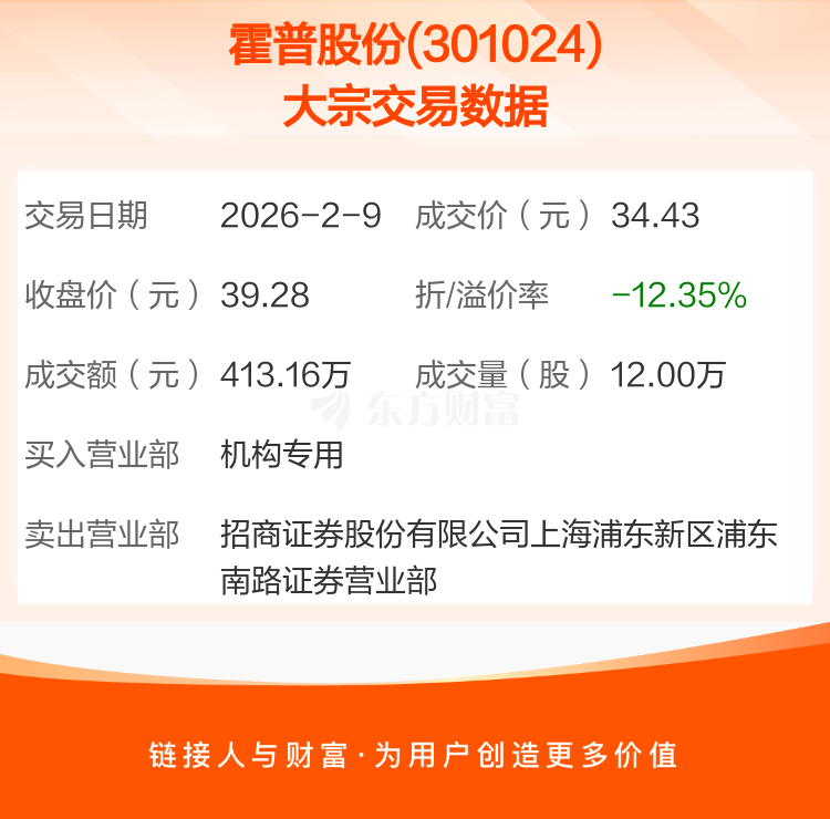 2026年2月9日,霍普股份发生1笔大宗交易,共成交12.00万股,成交金额413.16万元,占其流通市值比例为0.17%。