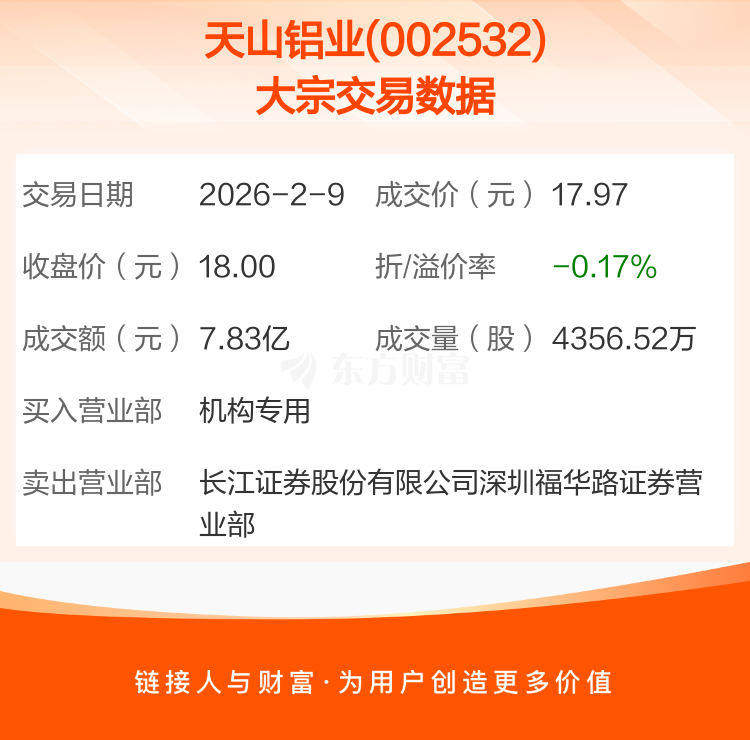 2026年2月9日,天山铝业发生1笔大宗交易,共成交4356.52万股,成交金额7.83亿元,占其流通市值比例为1.06%。