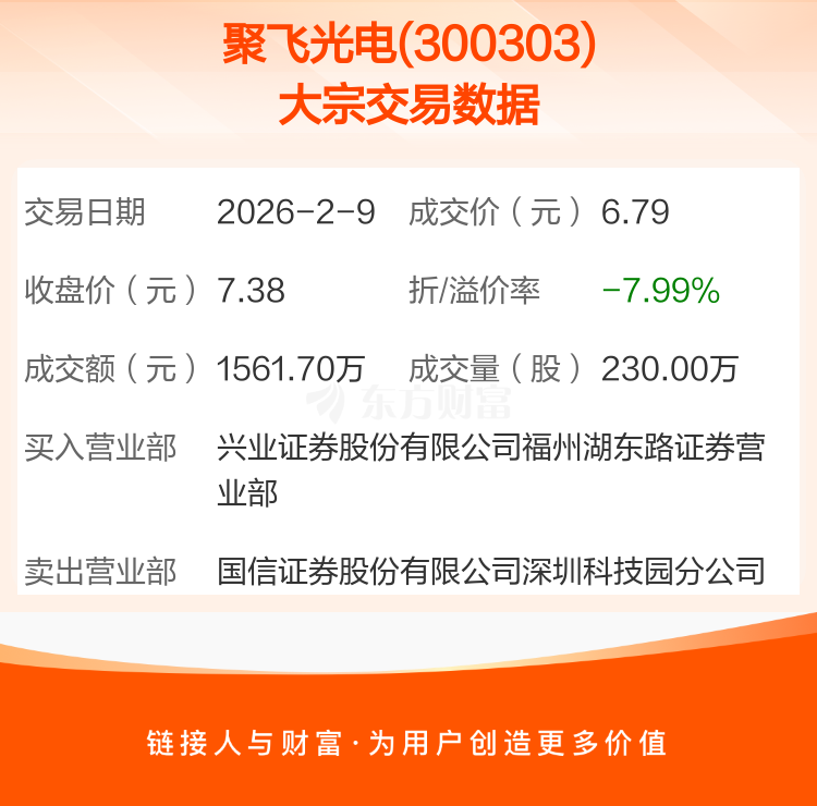 2026年2月9日,聚飞光电发生1笔大宗交易,共成交230.00万股,成交金额1561.70万元,占其流通市值比例为0.16%。