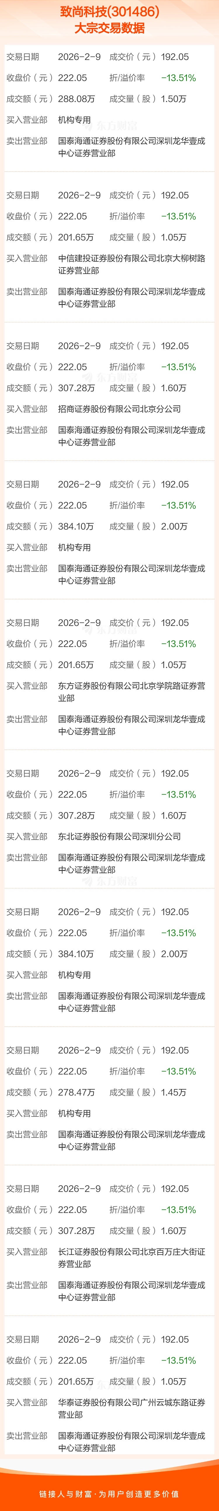 2026年2月9日,致尚科技发生10笔大宗交易,共成交14.90万股,成交金额2861.54万元,占其流通市值比例为0.18%。