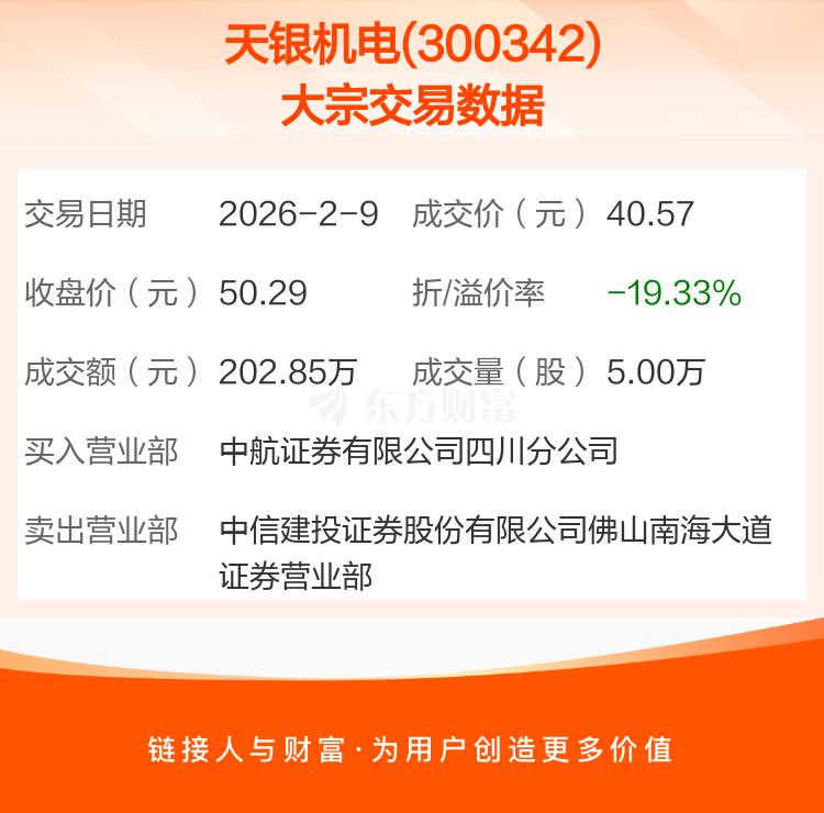 2026年2月9日,天银机电发生1笔大宗交易,共成交5.00万股,成交金额202.85万元。