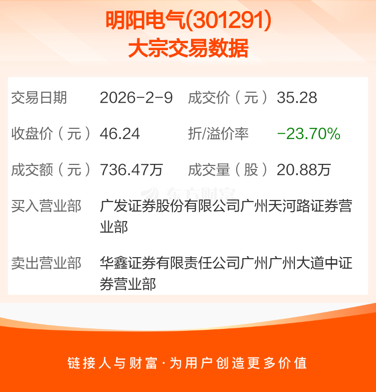 2026年2月9日,明阳电气发生1笔大宗交易,共成交20.88万股,成交金额736.47万元,占其流通市值比例为0.10%。