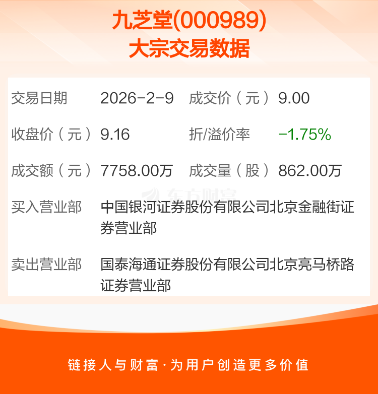 2026年2月9日,九芝堂发生1笔大宗交易,共成交862.00万股,成交金额7758.00万元,占其流通市值比例为1.22%。