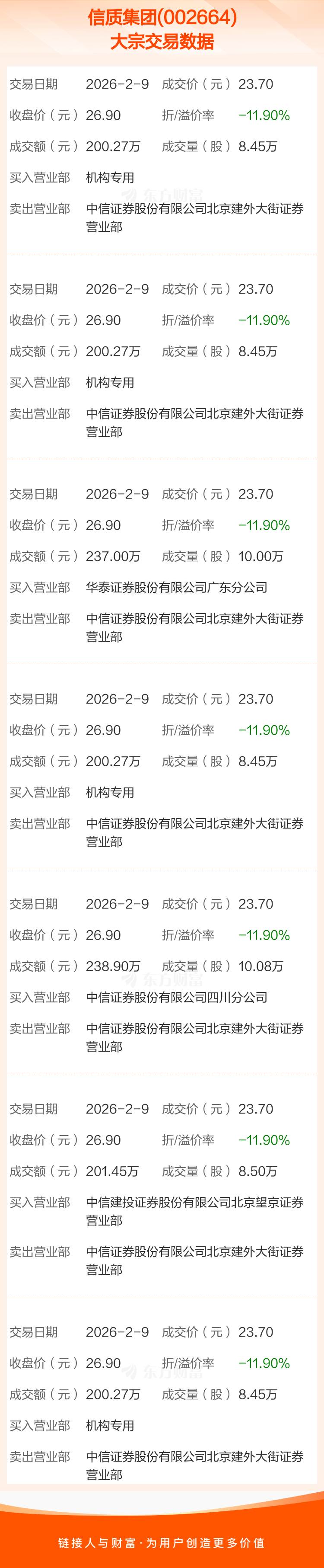 2026年2月9日,信质集团发生7笔大宗交易,共成交62.38万股,成交金额1478.43万元,占其流通市值比例为0.14%。