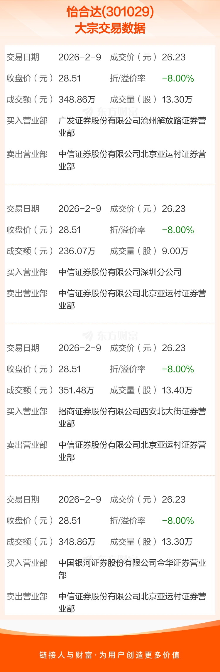 4笔大宗交易成交均价26.23元,较该股当日收盘价28.51元折价8.00%。