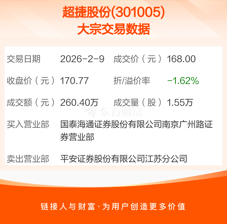 2026年2月9日,超捷股份发生1笔大宗交易,共成交1.55万股,成交金额260.40万元,占其流通市值比例为0.01%。