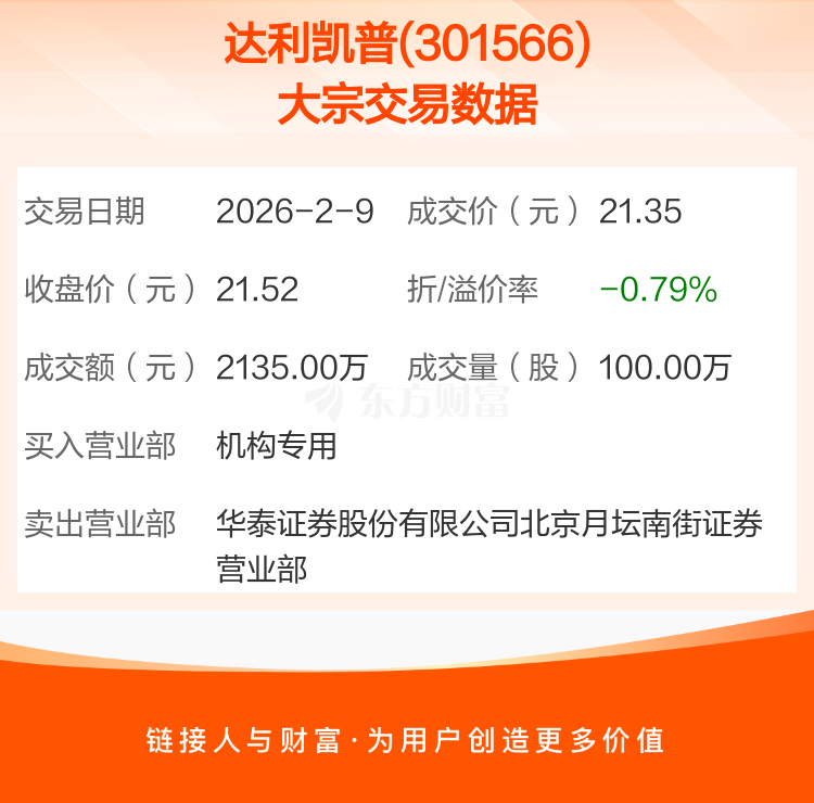 2026年2月9日,达利凯普发生1笔大宗交易,共成交100.00万股,成交金额2135.00万元,占其流通市值比例为0.48%。