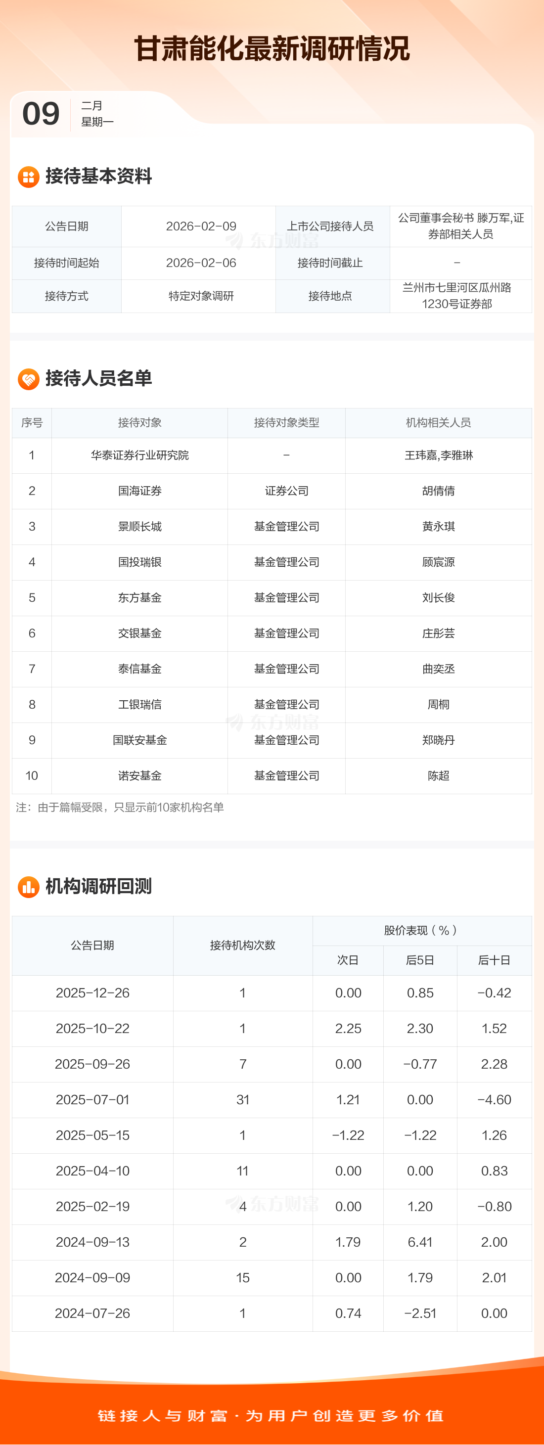 甘肃能化2月9日公告称,2月6日接待华泰证券行业研究院等17家机构调研。接待人员包括公司董事会秘书 滕万军,证券部相关人员。
