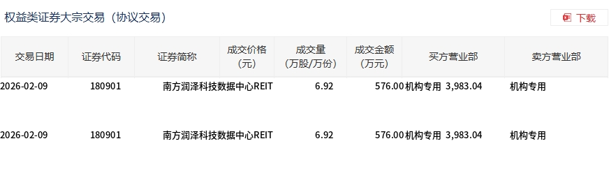 2月9日,南方润泽科技数据中心REIT大宗交易成交1152万股,成交额7966.08万元,占当日总成交额的83.65%,成交价6.92元,较市场收盘价6.899元溢价0.3%。
