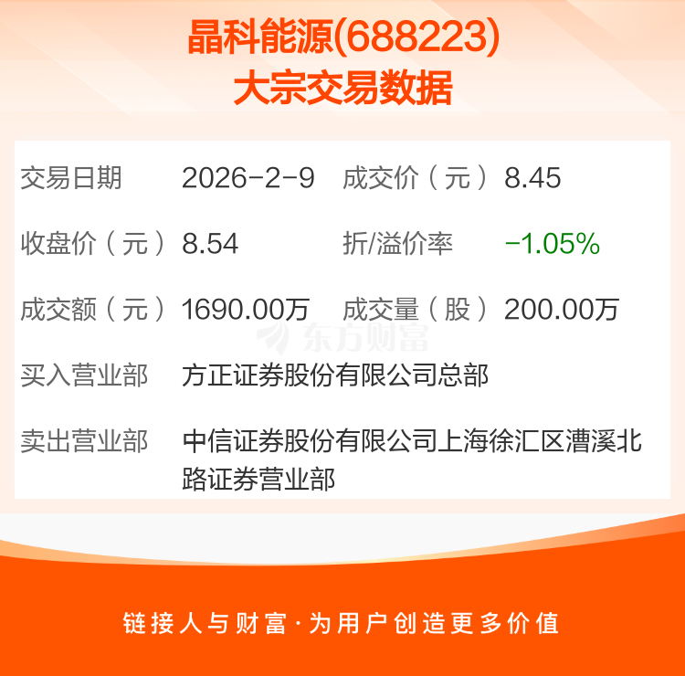 2026年2月9日,晶科能源发生1笔大宗交易,共成交200.00万股,成交金额1690.00万元,占其流通市值比例为0.02%。
