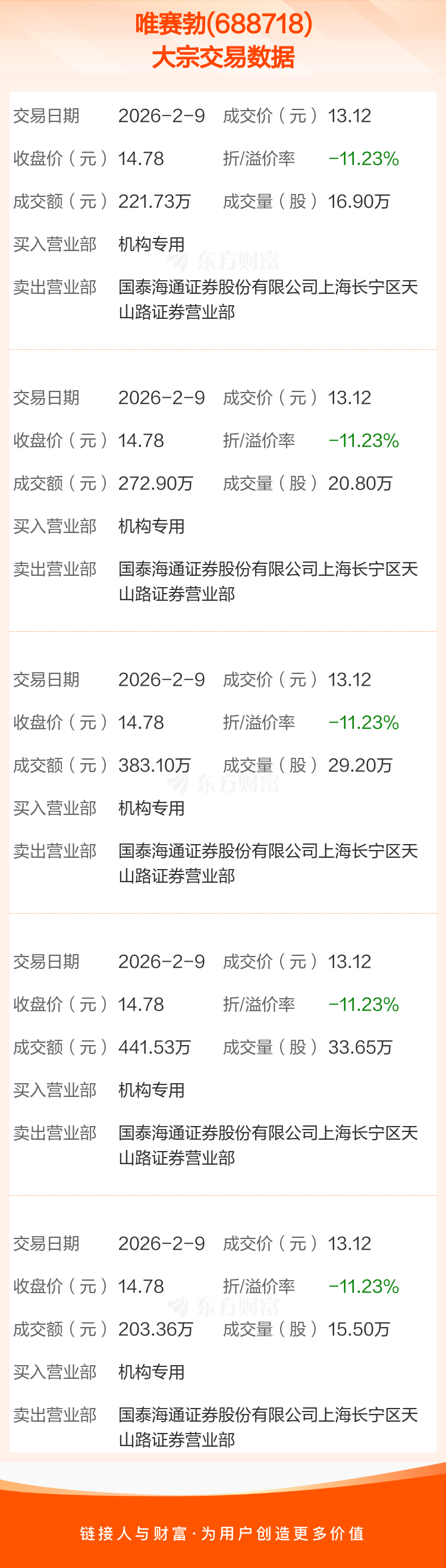 2026年2月9日,唯赛勃发生5笔大宗交易,共成交116.05万股,成交金额1522.62万元,占其流通市值比例为0.59%。