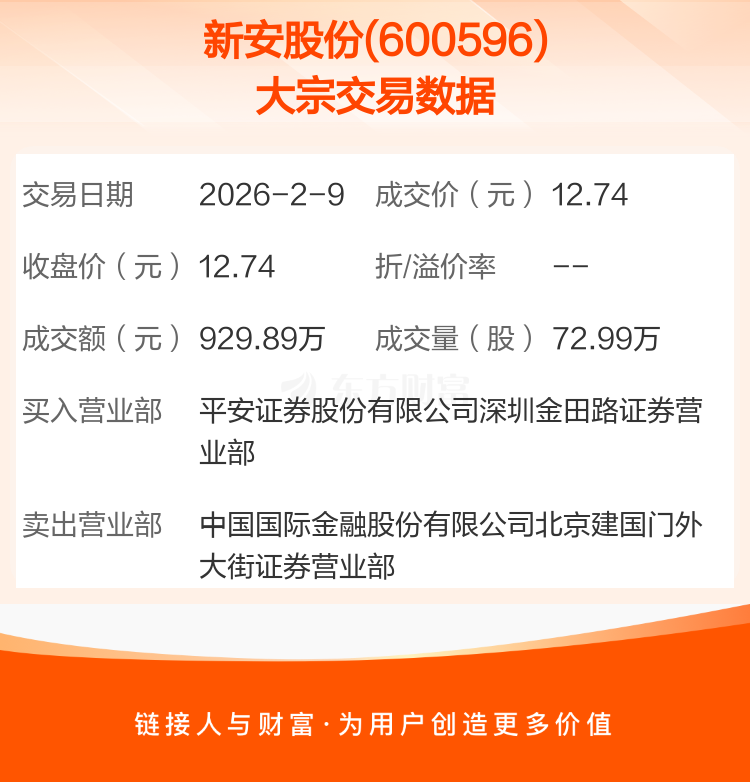 2026年2月9日,新安股份发生1笔大宗交易,共成交72.99万股,成交金额929.89万元,占其流通市值比例为0.05%。