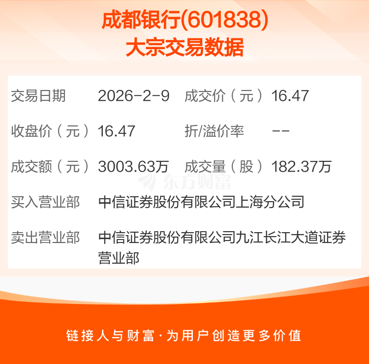 2026年2月9日,成都银行发生1笔大宗交易,共成交182.37万股,成交金额3003.63万元,占其流通市值比例为0.04%。