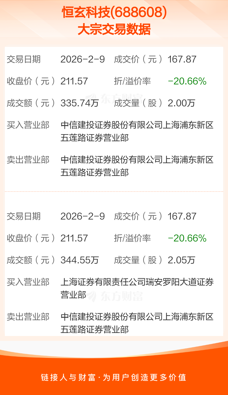 2026年2月9日,恒玄科技发生2笔大宗交易,共成交4.05万股,成交金额680.29万元,占其流通市值比例为0.02%。