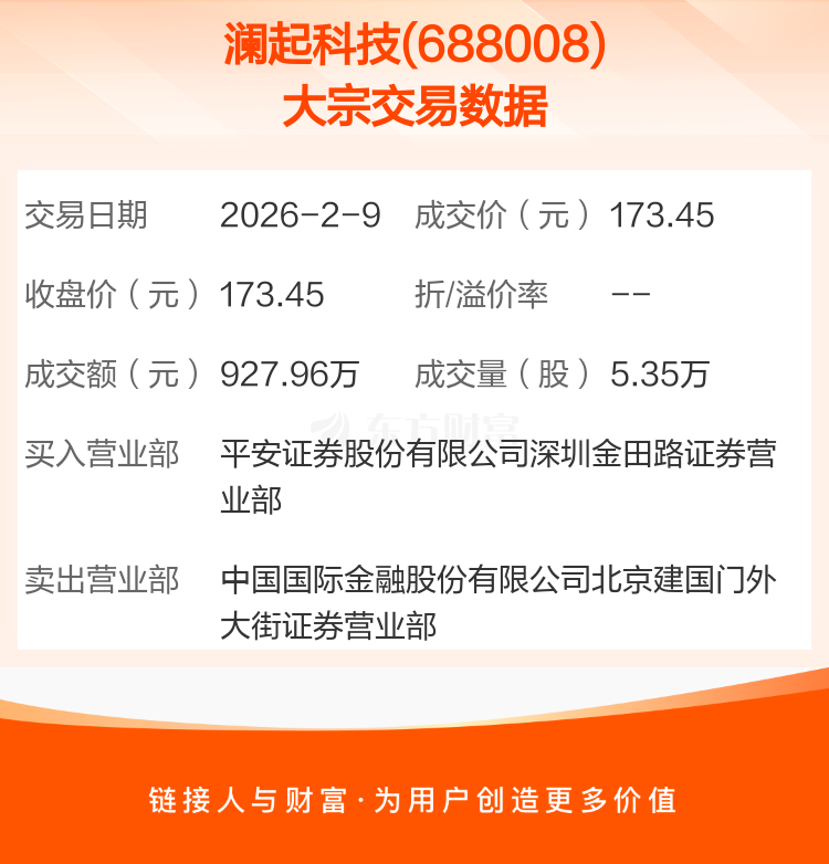 2026年2月9日,澜起科技发生1笔大宗交易,共成交5.35万股,成交金额927.96万元。