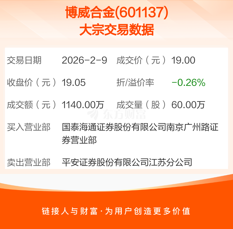 2026年2月9日,博威合金发生1笔大宗交易,共成交60.00万股,成交金额1140.00万元,占其流通市值比例为0.07%。