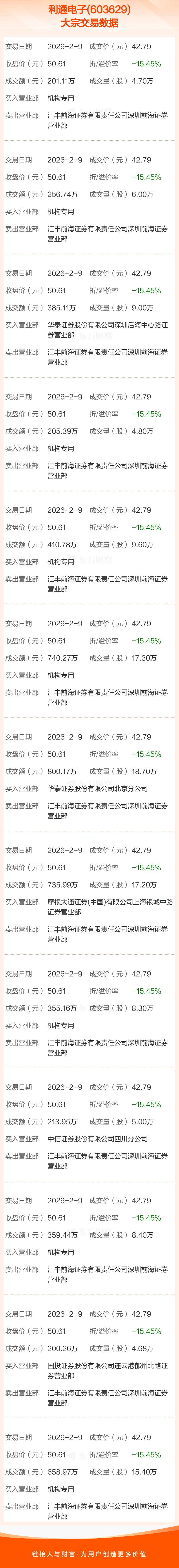 2026年2月9日,利通电子发生13笔大宗交易,共成交129.08万股,成交金额5523.34万元,占其流通市值比例为0.42%。
